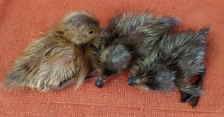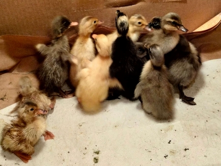 ce matin 3 nouveaux canetons sont nés = 12 canetons en pleine forme sur les 16 oeufs (qui avaient voyagé en colissimo en boite ovopack) !
